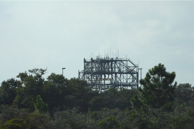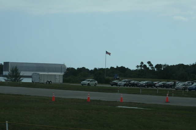 Pad 39A. Det är den absolut sista rymdfärjeuppskjutningen från den här startplattan. Vid uppskjutningen så sprutar man massor av vatten vid motorerna. Vattnet används för att absorbera ljudet vid uppskjutningen som annars kan skada rymdfärjan. Vattentornet till vänster innehåller allt vatten som används för detta. Den vita spetsen på tornet är en åskledare. Själva rymdskytteln Discovery kunde vi tyvärr inte se då den är omsluten av "Rotating Service Structure" som används för att arbeta med lastutrymmet. Ikväll kommer hon att bli synlig igen.