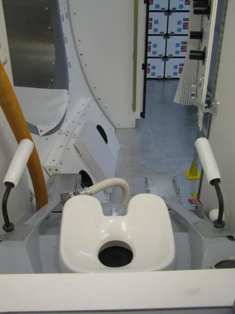 Just den här toan kommer från Atlantis. Det finns bara ett litet skynke att dra för så toalettbesöket blev inte allt för privat. Med rymddräkt och allt så är det väldigt omständligt att besöka toaletten. Ett besök tar ungefär 30 minuter.