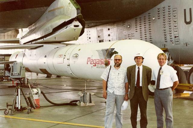 Det finns faktiskt redan ett sådant system i drift för att sända upp små satelliter, raketen Pegasus som byggs av amerikanska Orbital Sciences och släpps från ett flygplan av typen Lockheed 1011, den gamla jumbon Tristar. Pegasus har funnits i tjugo år men har väl inte medfört någon revolution när det gäller att sända upp små satelliter. Redan 1989 övervägde vi i Sverige att använda Pegasus för att sända upp Freja-satelliten, som ju till slut sändes upp med en kinesisk raket – Långa Marschen 2C. Men jag själv och Peter Rathsman (numera anställd på OHB-Sweden) var och tittade på Pegasus när den provhängdes under vinge på en B-52-bombare ute på Edwardsflygbasen i Kalifornien. NASA:s gamla B-52:a, som använts för raketplanet X-15 redan på 1950-talet, släppte Pegasus vid de första provskotten. På bilden nedan ser ni mig till vänster, Peter Rathsman i mitten och en tjänsteman från raketfirman Hercules till höger. Notera alla påmålade farkostsymboler på B-52:an. Det är inte nedskjutna fiendeplan utan släppta försöksfarkoster som markerats på det viset.