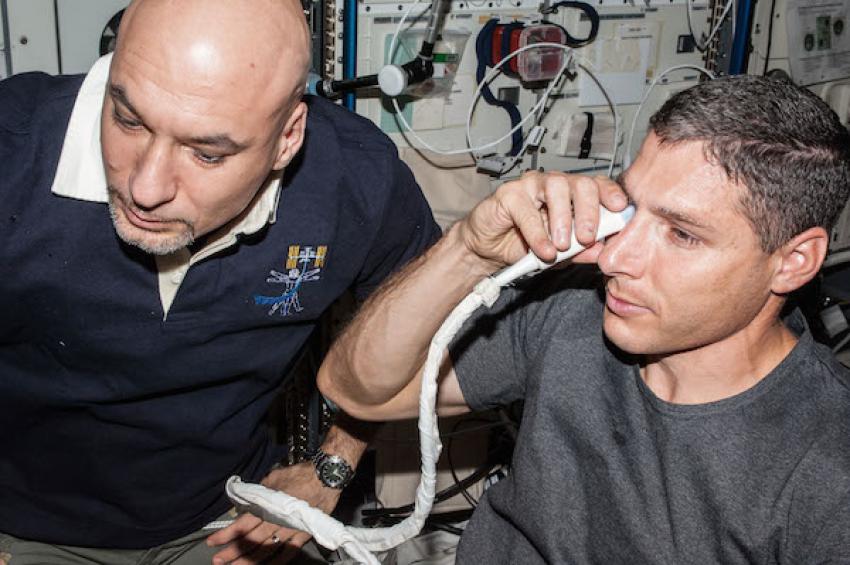 Bild: Astronauterna Michael Hopkins och Luca Parmitano genomför en ultraljudsundersökning av ögonen under en tidigare rymdresa. Källa: Nasa.
