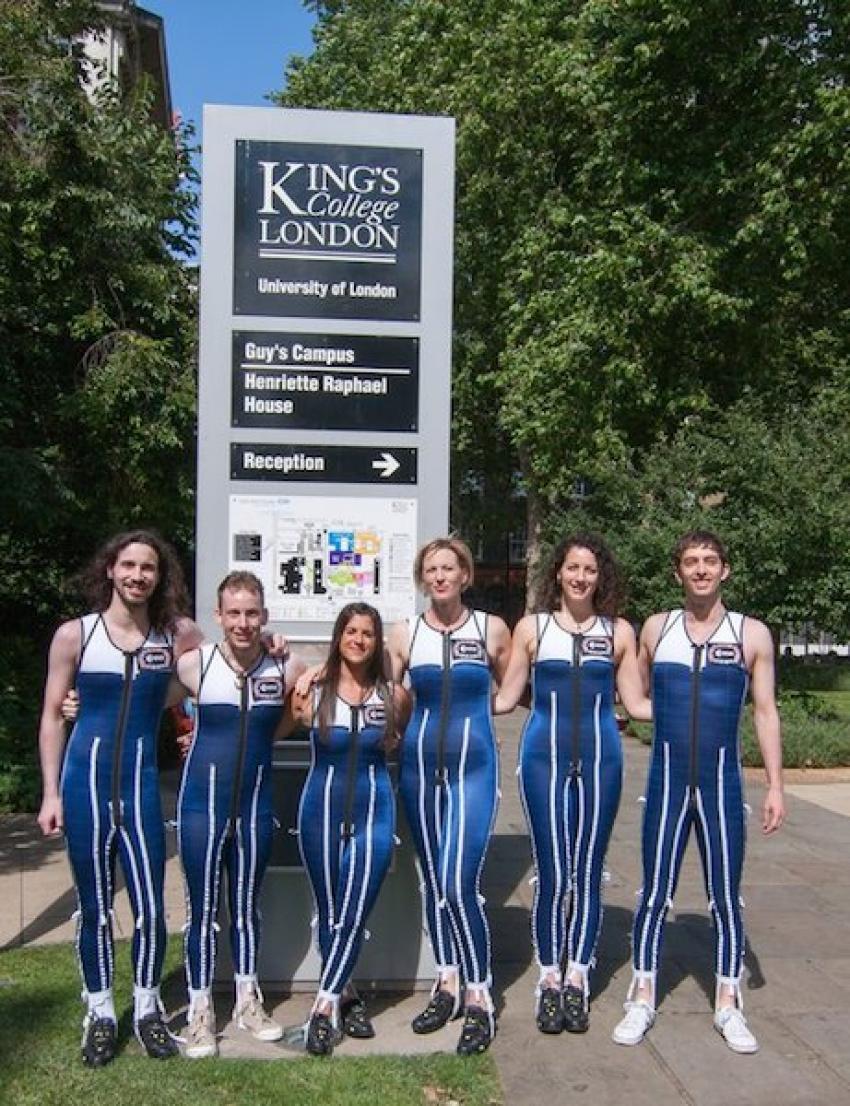 Bild: Några studenter på Kings College London i London visar upp dräkter speciellt anpassade för tyngdlöshetens påverkan på kroppen under en rymdresa. Källa: Kings College London